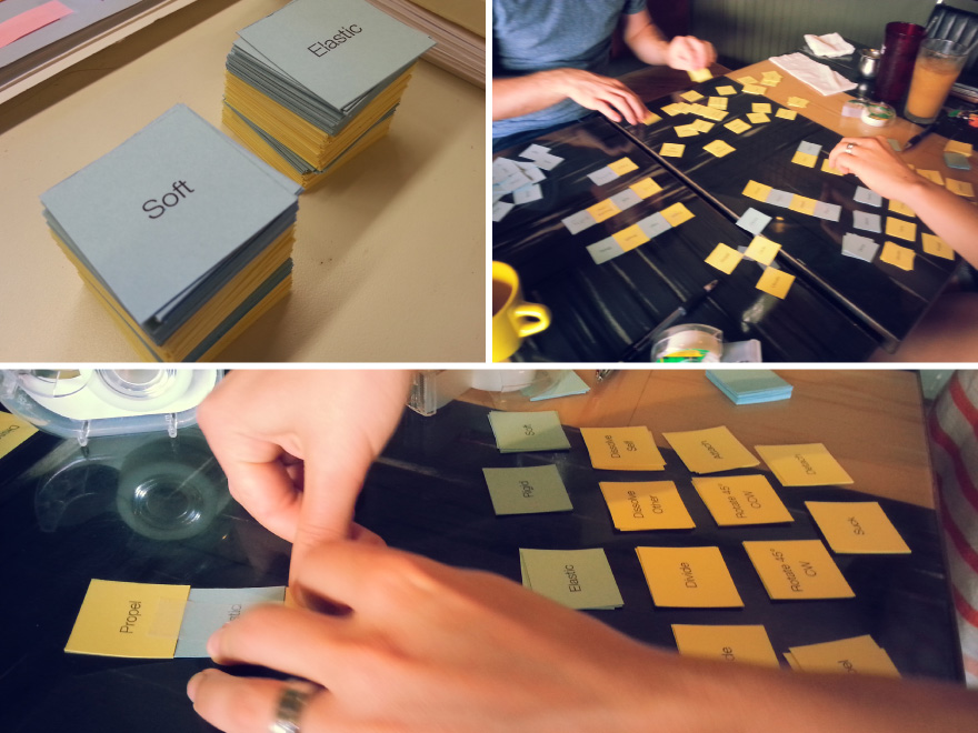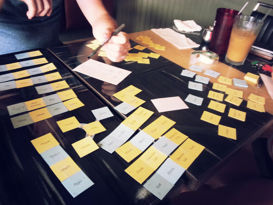 The process started by experimenting with paper models. Different color papers were assigned either as adjectives (soft, hard, etc) or verb (divide, propel, etc.). Two participants were involved to test-play the paper models. The idea was to try and see whether different configurations would create different “creatures”, namely, what sort of creatures would emerge from the combinations of various properties.