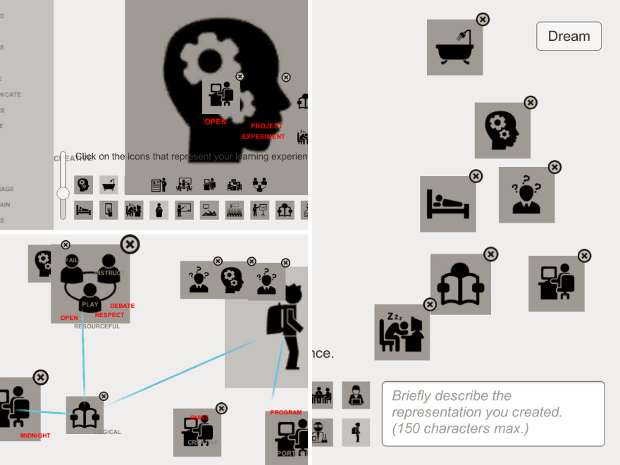 The participants were not only asked to express their “present learning experiences” using the digital tool prototype, but they were also asked about the possibility of co-creating with other people in a digital networked space. The sentiments of the participants of the possibility to co-create with other people were overwhelmingly positive. The feedback and analysis we obtained from this early research led us to the development of a networked app prototype: Collective Dreaming in the Virtual World.